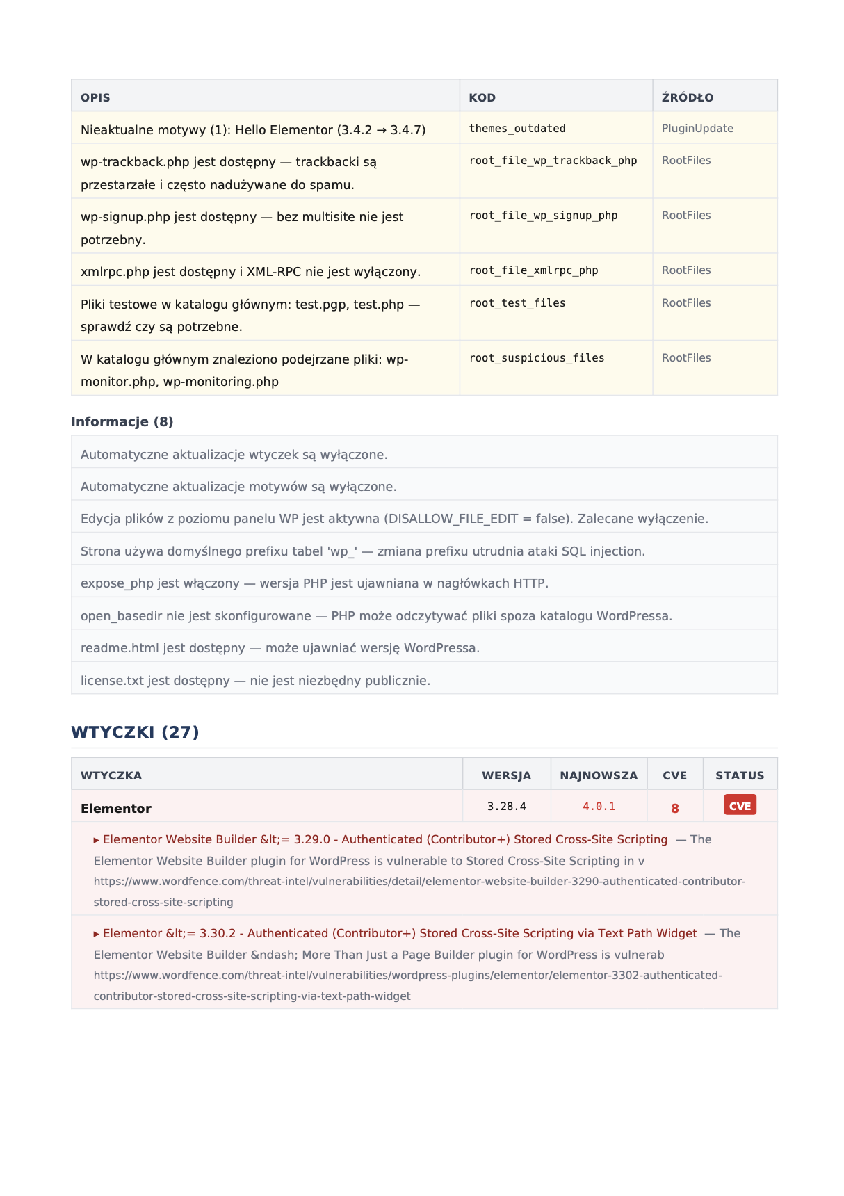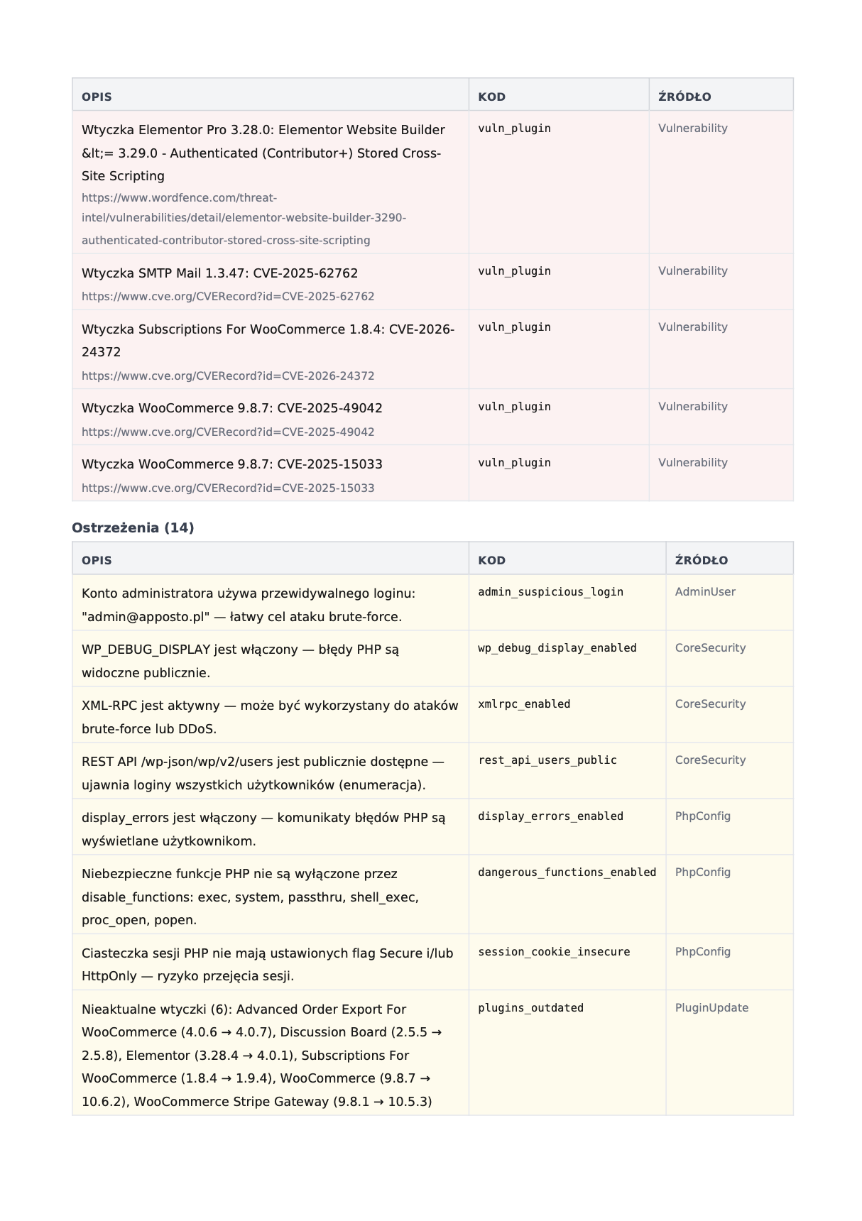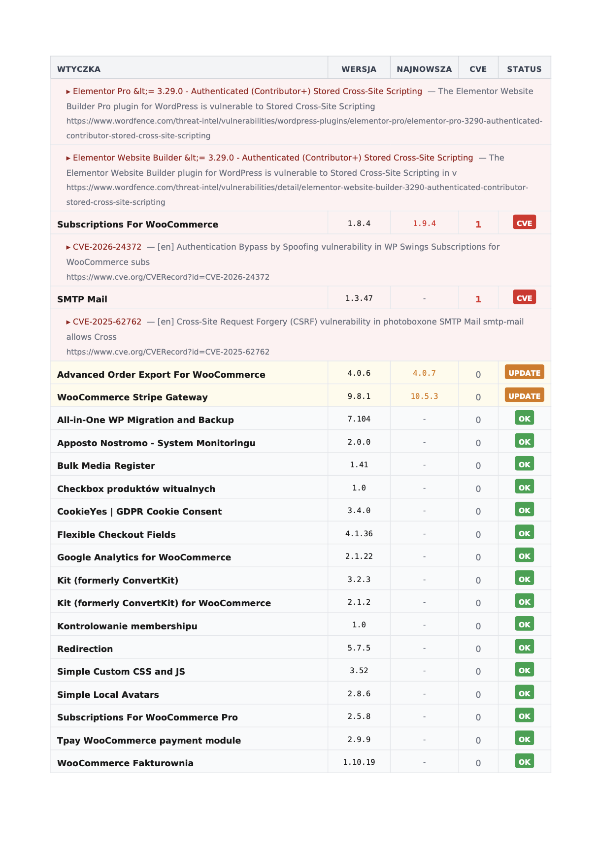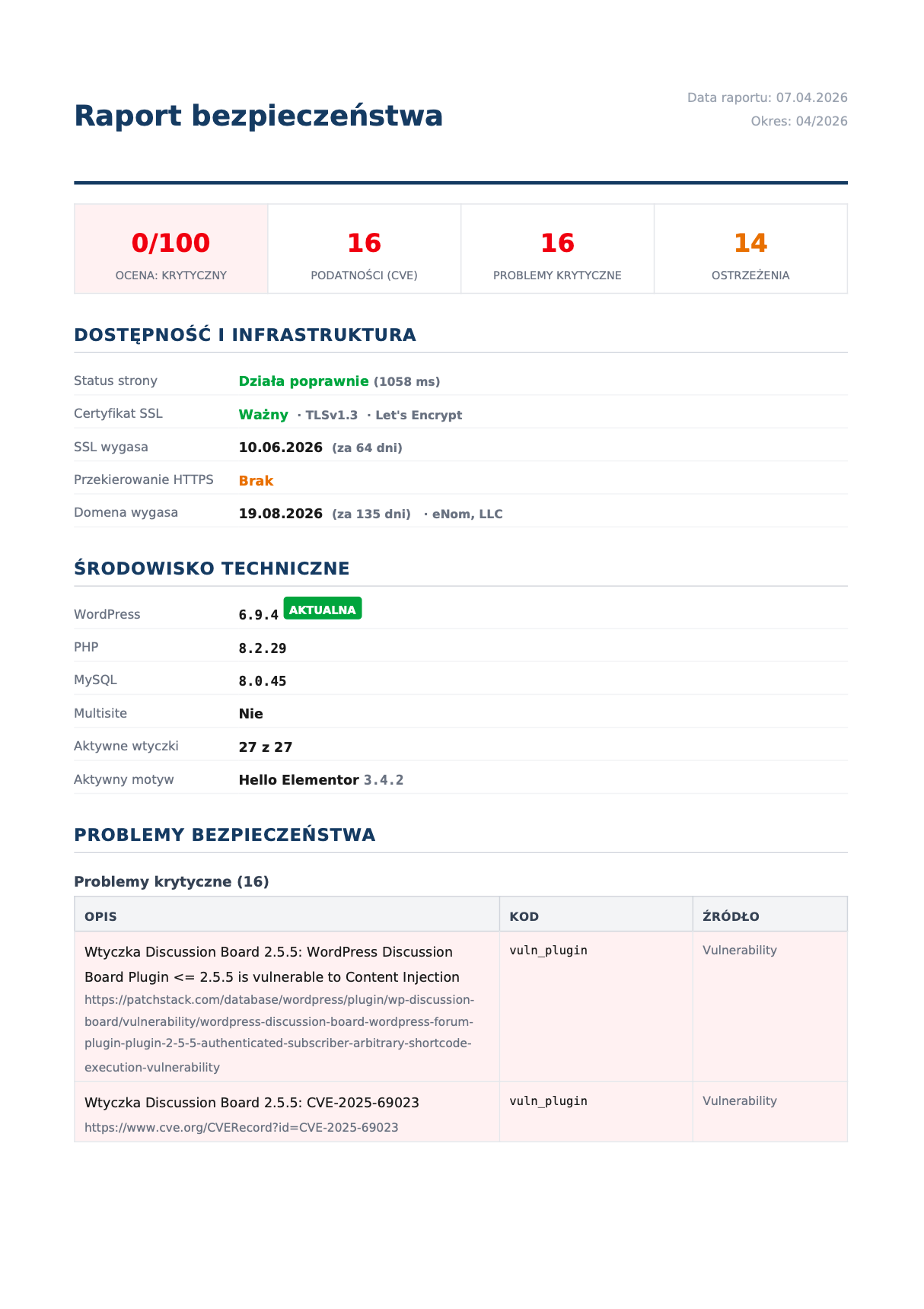 Zobacz jak to wygląda w praktyceProfesjonalny dokument PDF ze szczegółowym przeglądem bezpieczeństwa. Konkretne dane — wersje, podatności, oceny. Możesz go przekazać swoim klientom jako element usługi utrzymania.